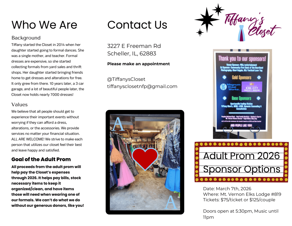 If you would like to support the fundraiser, see the materials below and contact them at 3227 E Freeman Rd Scheller, IL, 62883 – @TiffanysCloset – tiffanysclosetnfp@gmail.com